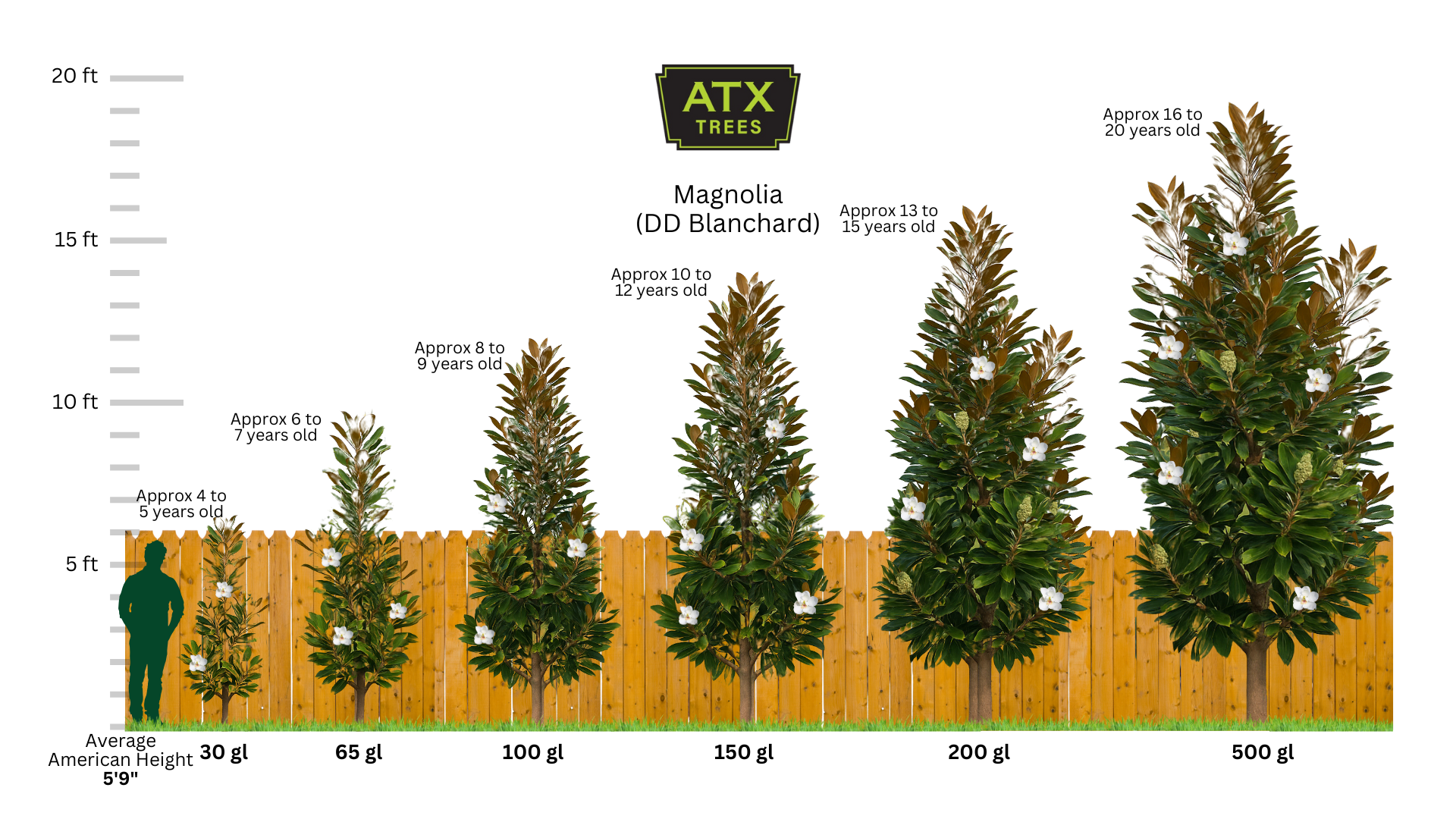 Magnolia (DD Blanchard) | 5 – 7 ft ~ 4 - 5 yrs | 8 – 10 ft ~ 6 - 7 yrs | 10 – 12 ft ~ 8 - 9 yrs | 12 – 14 ft ~ 10 - 12 yrs | 14 – 16 ft ~ 13 - 15 yrs | 18 – 20+ ft ~ 16 - 20 yrs | |