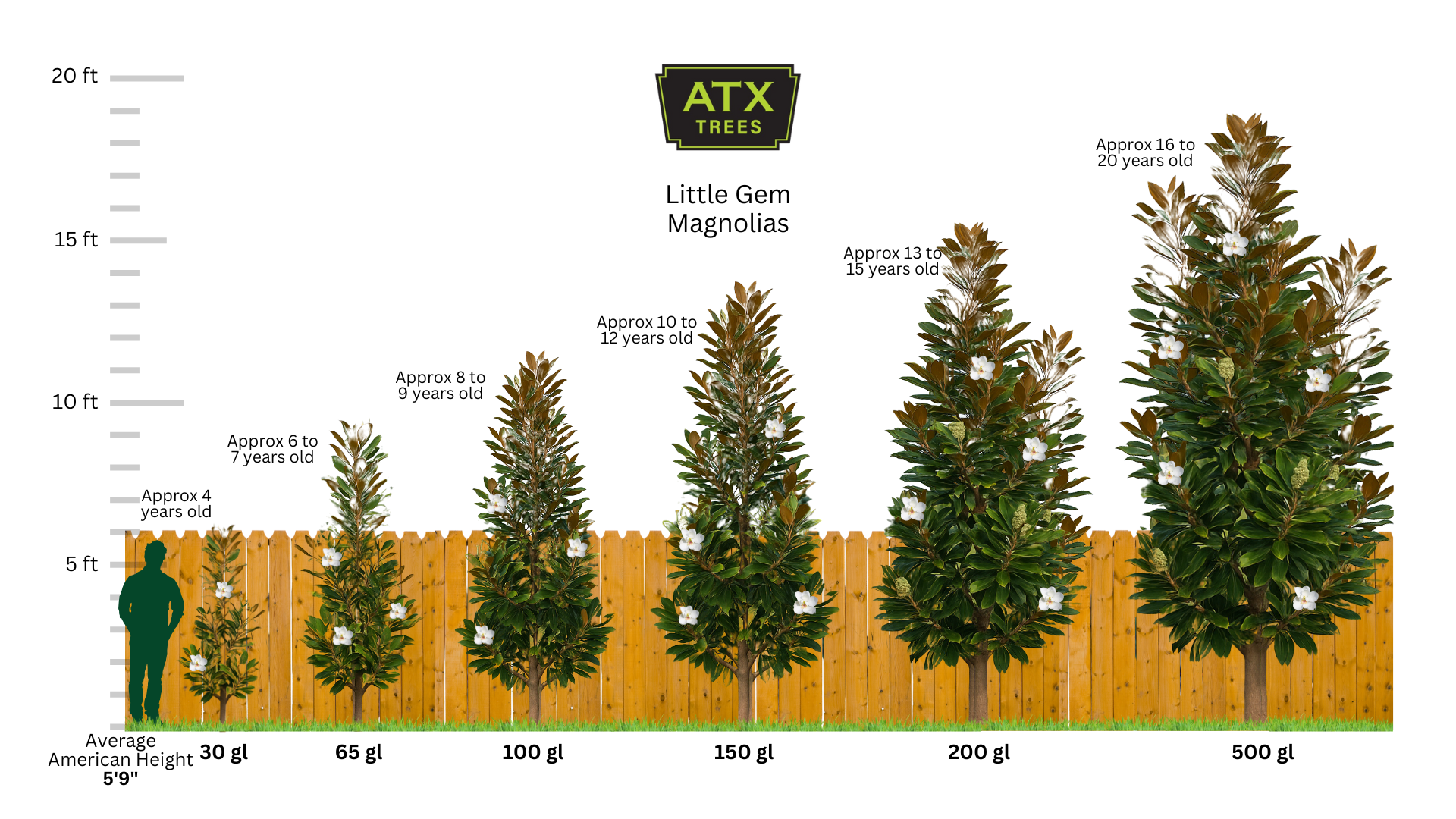 Little Gem Magnolia | 5 – 7 ft ~ 4 yrs | 8 – 10 ft ~ 6 – 7 yrs | 10 – 12 ft ~ 8 – 9 yrs | 12 – 14 ft ~ 10 – 12 yrs | 14 – 16 ft ~ 13 – 15 yrs | 18+ ft ~ 16 – 20 yrs | |